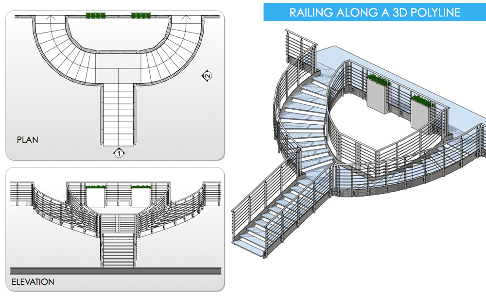 3DMD Railings are archicad object tools. You can simple draw a 3d polyline both 2d and 3d window. You can create curved and sloped path. There are many parameters for post, panel, cable, handrail; you can create you own rail. An option for list allow you to have the railing straightened in the schedule also with quantities for each elements of the railing. You can quickly manage in 2d/3d windows the position and visibility of posts and cables/panels.