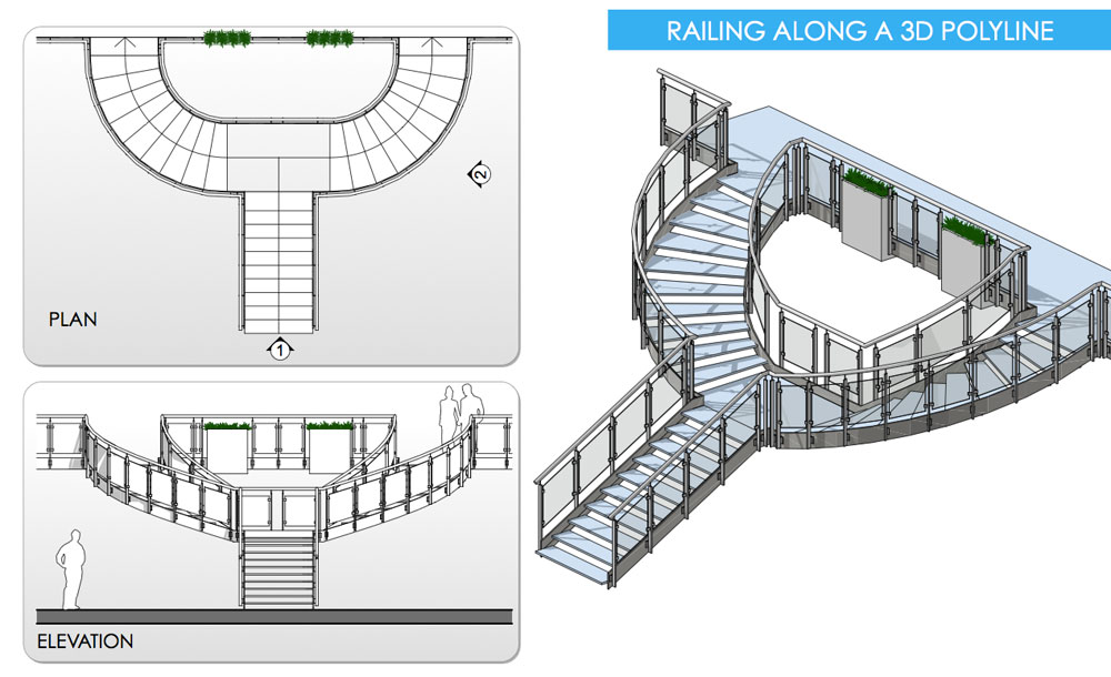 3DMD Railings are archicad object tools. You can simple draw a 3d polyline both 2d and 3d window. You can create curved and sloped path. There are many parameters for post, panel, cable, handrail; you can create you own rail. An option for list allow you to have the railing straightened in the schedule also with quantities for each elements of the railing. You can quickly manage in 2d/3d windows the position and visibility of posts and cables/panels.
