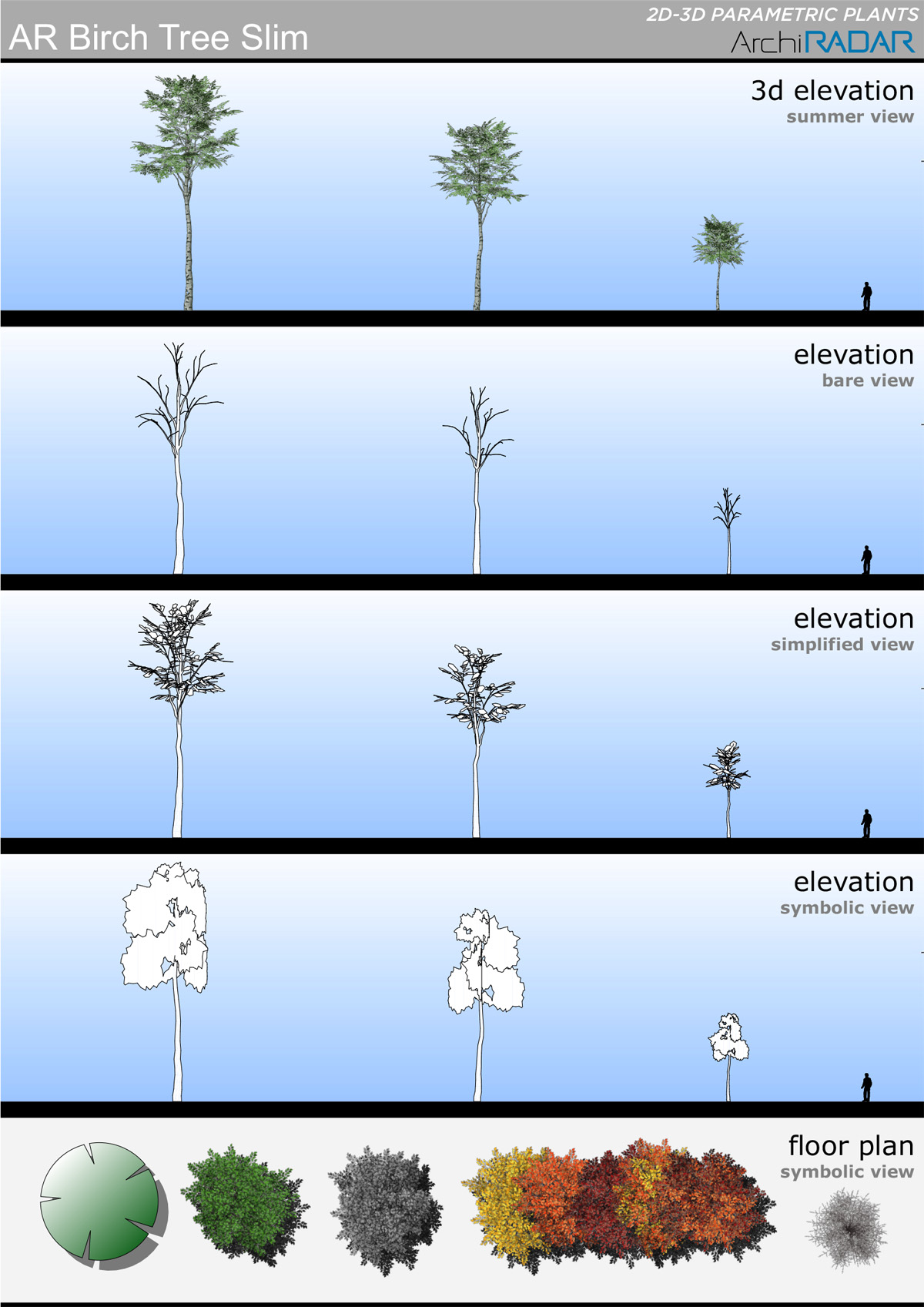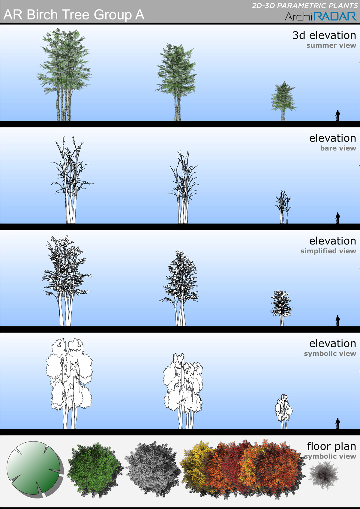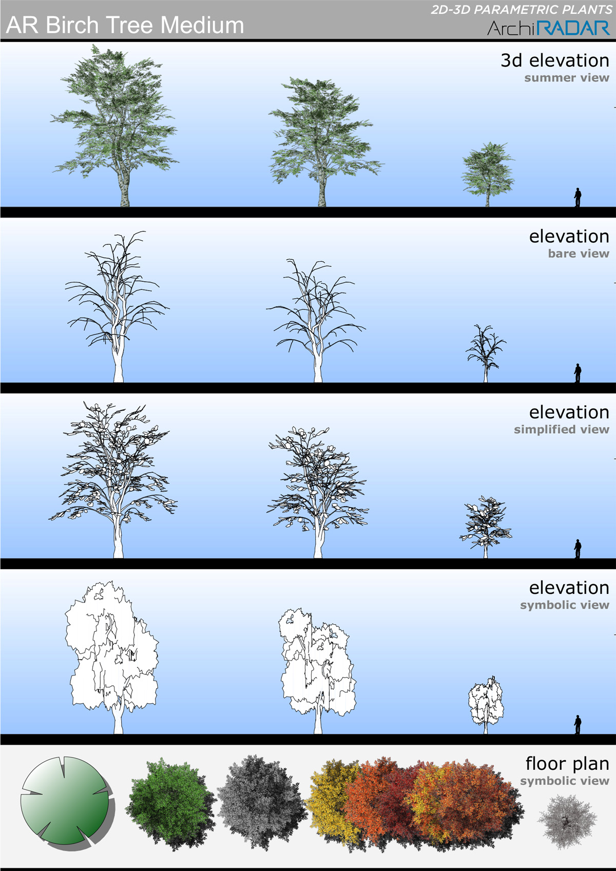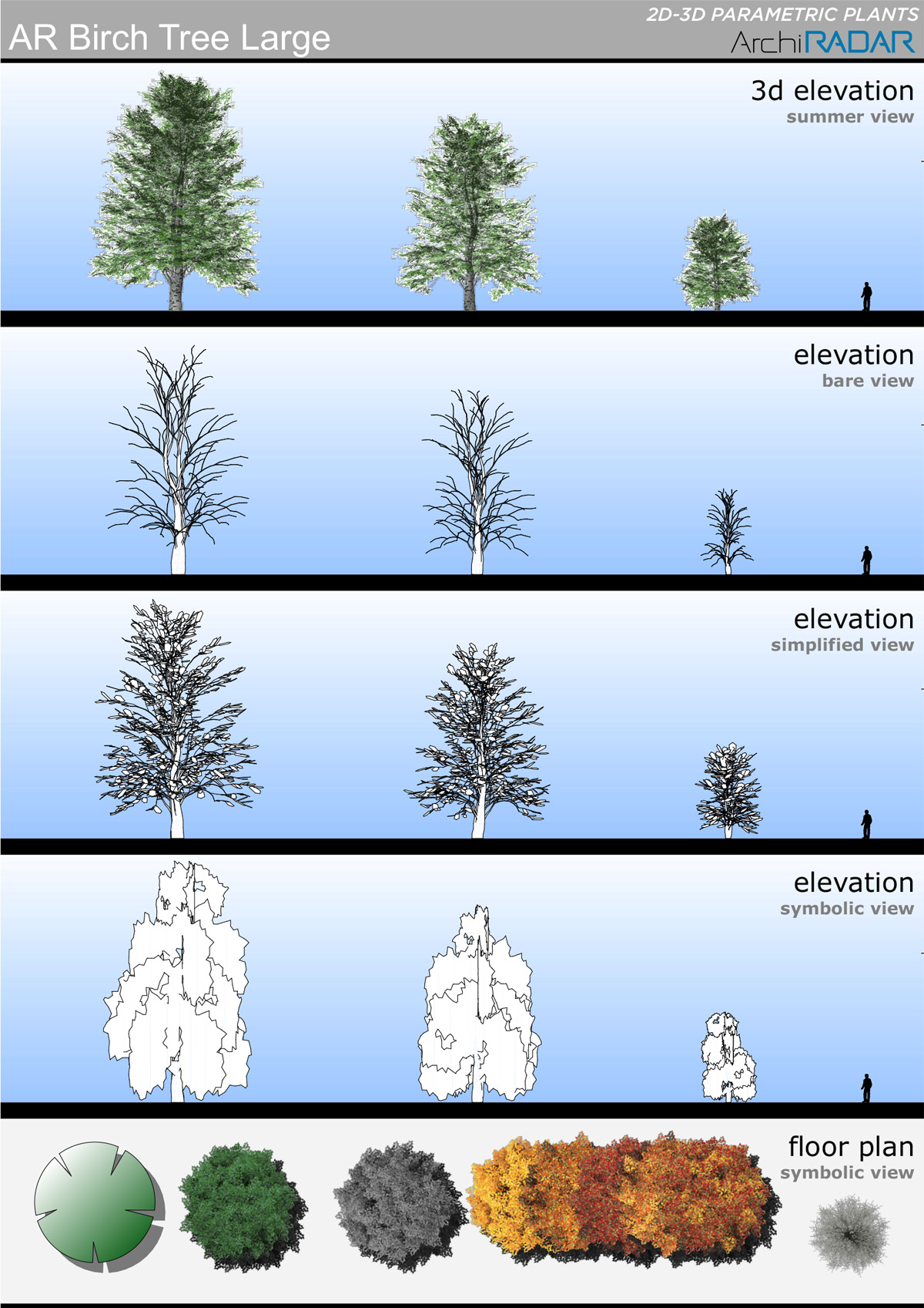 The objects are made with a low polygon quantity, they have a real growing factor according to the size and a corresponding symbolic view in elevation. Optimized for BIMX.