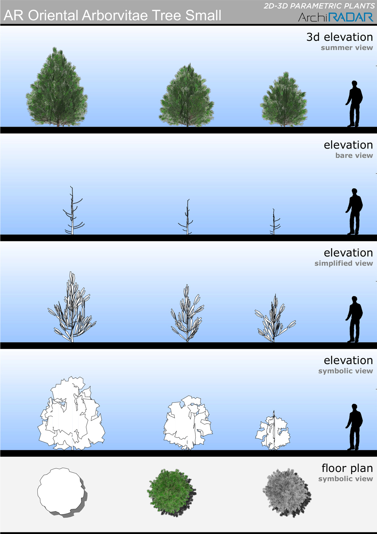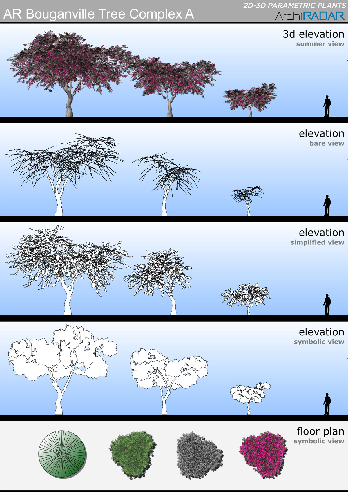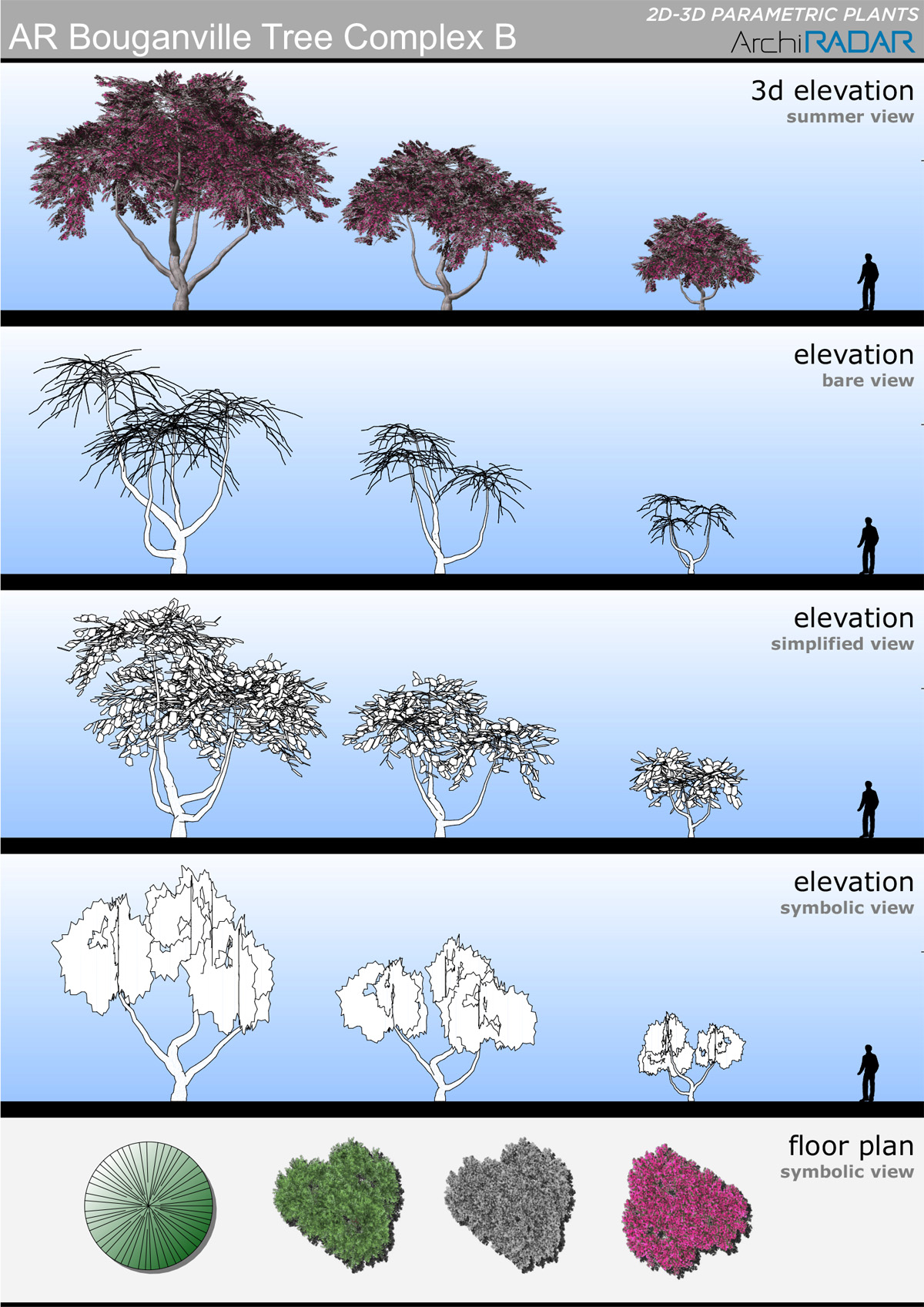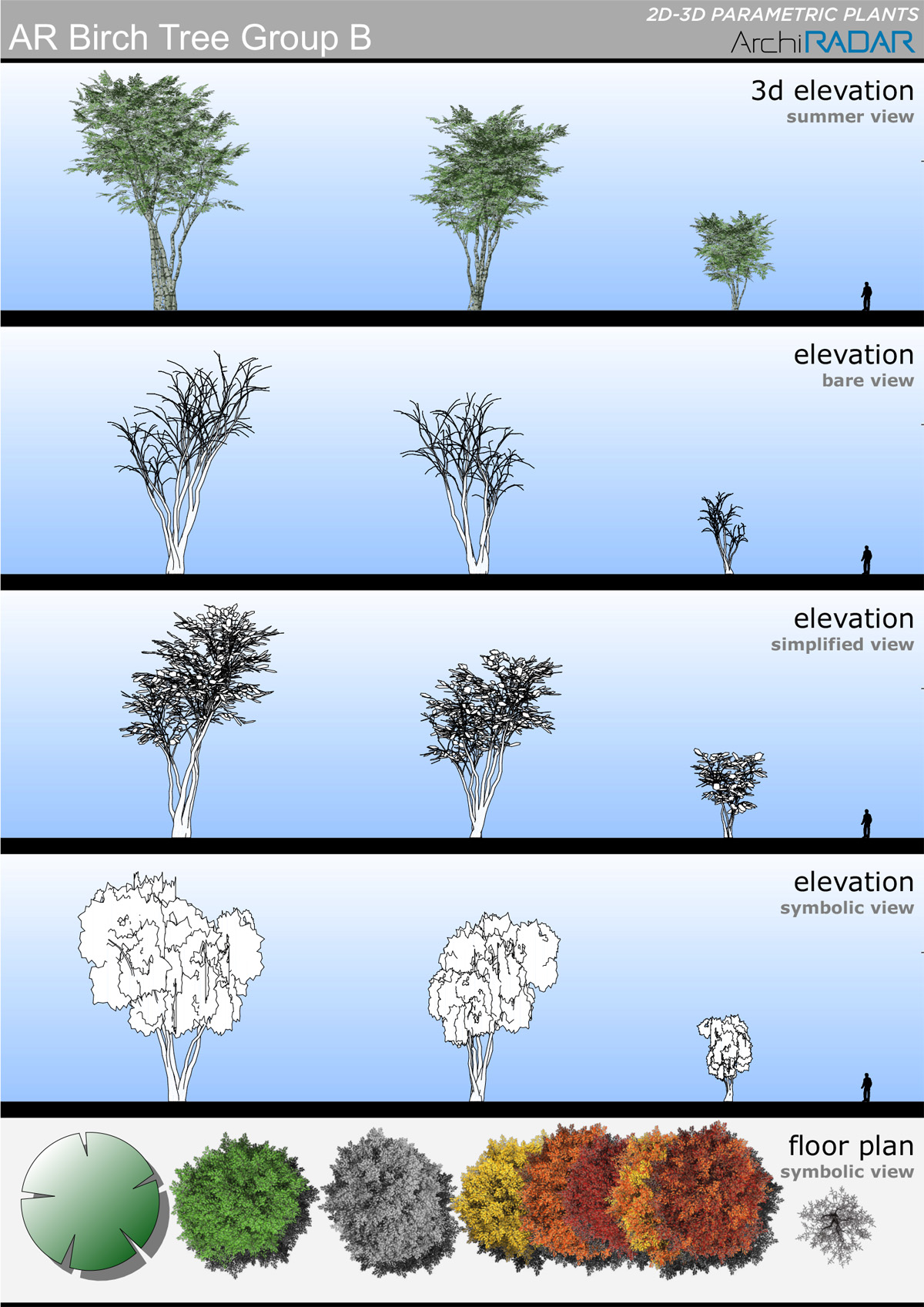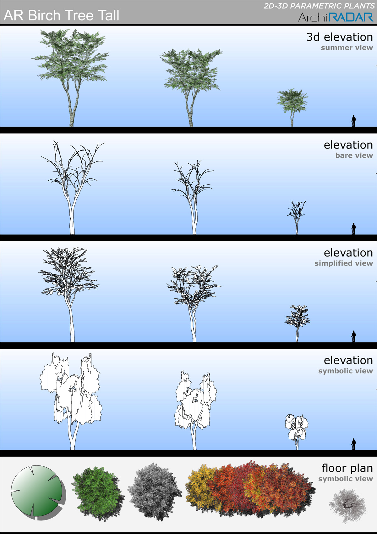 The objects are made with a low polygon quantity, they have a real growing factor according to the size and a corresponding symbolic view in elevation. Optimized for BIMX.