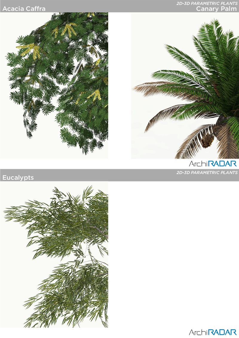 16 3D models of several trees, compatibles with ArchiCAD 16 or higher and CineRender.