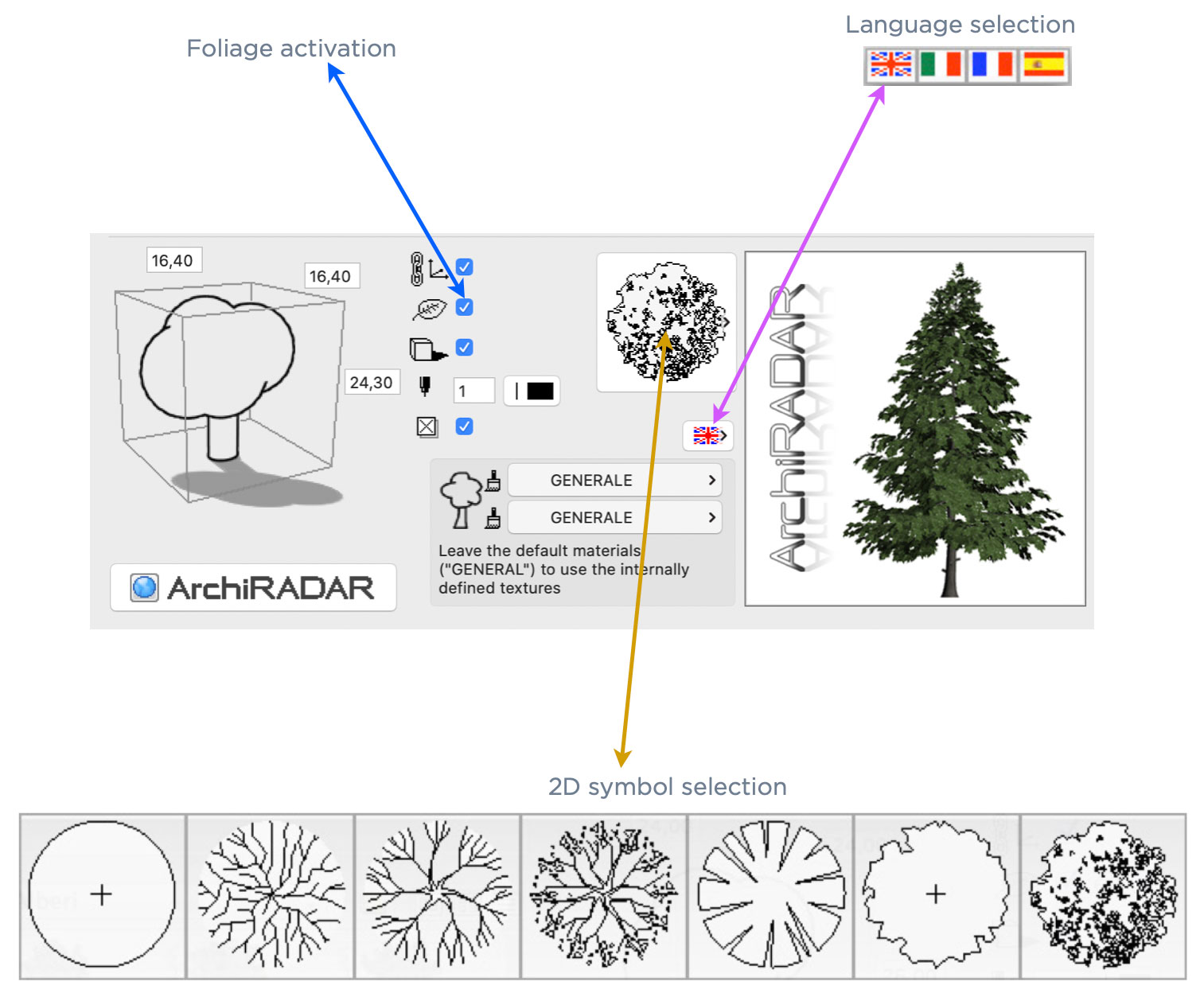 In addiction to that, for each species there is a seventh object called "Random Tree": it's a useful tool that, with a simple click, adds to the scene a random tree in order to avoid repetitions.