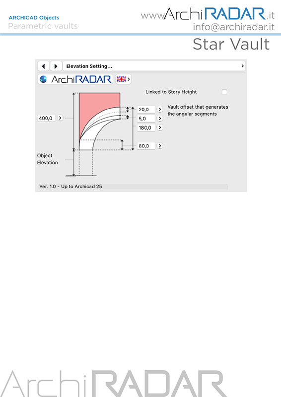 ALERT - LIMITS OF USE: This object is editable and adjustable from the ARCHICAD 19 version up to the current version at the time of purchase. When a new version of ARCHICAD is released and you decide to switch to it, you will need to download the paid update of the vault from the ArchiRADAR shop at a reduced cost; you will be able to use a discount code received at the time of purchase. If you do not proceed with the update, the object can be viewed and used for the documents but it will no longer be editable and adjustable.