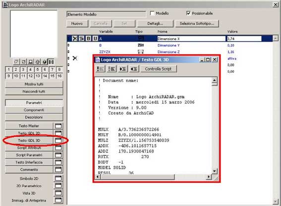 Adesso clicchiamo sulla finestra bianca accanto il tasto“Testo GDL 3D”  che ci farà apparire la finestra con le righe di comando.