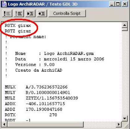 Inseriamo, all’inizio del testo, 2 nuove righe di comando: “ROTX girax” e “ROTZ giraz”