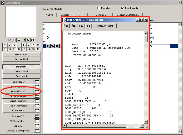 Adesso clicchiamo sulla finestra bianca accanto il tasto“Testo GDL 3D”  che ci farà apparire la finestra con le righe di comando