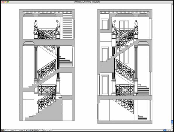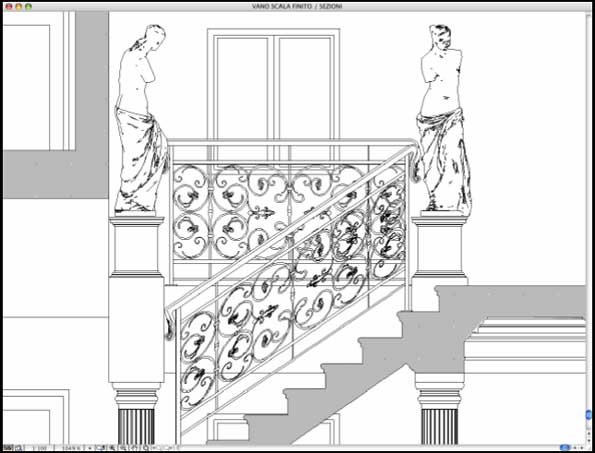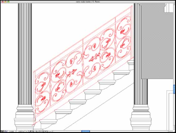 A questo punto del lavoro la creazione dei parapetti orizzontali si può ritenere conclusa. Rimangono da risolvere le problematiche lungo le rampe delle scale. ArchiCAD non permette una distorsione dei tracciati bidimensionali e quindi per risolvere il problema si è deciso di utilizzare Adobe Illustrator e i suoi comandi di distorsione. Per prima cosa bisogna inserire il parapetto all'interno del vano scale in modo da poter tracciare attraverso la pendenza delle rampe il delta di distorsione.