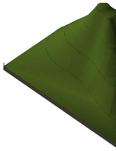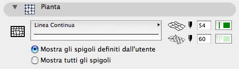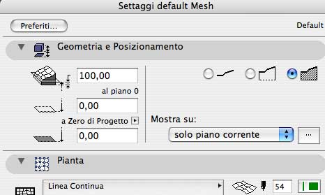 Il lavoro è stato completatoi. È sicuramente molto più lungo a descrivere il procedimento che in fondo realizzarlo. Vediamo adesso alcuni suggerimenti sulla visualizzazione e gestione di terreni 3D in ArchiCAD. Se, ad esempio, non volete visualizzare in pianta le triangolazioni che abbiamo appena visto, occorre selezionare la mesh creata e aprire il dialogo dei Settaggi dello Strumento Mesh (doppio click sullo strumento mesh nella palette strumenti). Nel pannello "Pianta" cliccate su "Mostra gli spigoli definiti dall'utente".