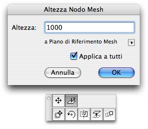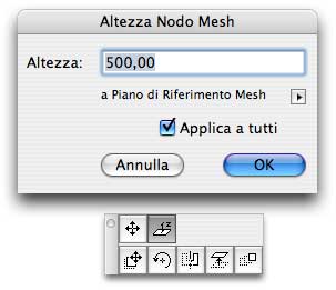 Vediamo adesso come assegnare una quota ad ogni curva di livello. Assicurarsi nuovamente che la Mesh e lo Strumento Mesh siano entrambi selezionati e fare un click sopra un punto della prima curva di livello. Apparirà così la "Pet-Palette" di ArchiCAD che, tra le varie opzioni, ci dà la possibilità di dare una quota secondo l'asse Z. Cliccare quindi sull'icona con la piccola lettera "Z" in modo da far apparire il sottomenu "Altezza Nodo Mesh".