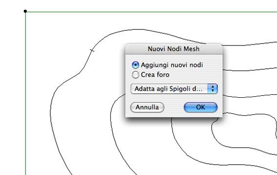 Con entrambi selezionati teniamo premuta la barra spaziatrice sulla tastiera in modo da far apparire l'icona della Bacchetta Magica (ricordiamo che la bacchetta magica funziona con qualsiasi strumento di ArchiCAD) e facciamo un click con il mouse sulla prima curva di livello. Apparirà così il menu "Nuovi Nodi Mesh" nel quale dobbiamo specificare se il contorno (la curva di livello) su cui abbiamo cliccato deve creare un foro sulla mesh oppure deve creare nuovi nodi. Scegliamo quindi "Aggiungi nuovi nodi", dal menu a tendina scegliamo "Adatta agli Spigoli definiti dall'utente" e clicchiamo su OK.