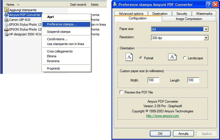 Vi consiglio di settare questi parametri come default, poi di caso in caso potrete modificarli a piacimento. Andiamo quindi in Start\Pannello di controllo\Stampanti e fax (scusatemi la lungaggine ma è universale per tutti i sistemi Windows 2000 e XP). Poi tasto destro su Amyuni PDF Converter e dal menu contestuale selezionare Preferenze stampa...