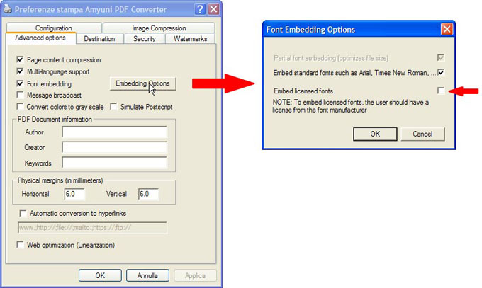 Per prima cosa bisogna attivare le due opzioni Multi-language support e Font embedding. La prima opzione eviterà di sballare la tabella di alcuni caratteri speciali, tipo le lettere accentate, simboli particolari nei vari layout di lingua. La seconda incorporerà i font da noi utilizzati nel PDF, anche se ancora dobbiamo fare un'altro passaggio. Clicchiamo sul tasto Embedding Options.