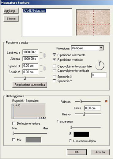 Clicco sull'icona della barra "Prepara documento" che mi apre la finestra di dialogo con gli "Shaders" e quindi clicco sul tasto "Modifica" facendo apparire la finestra di dialogo "Mappatura texture".