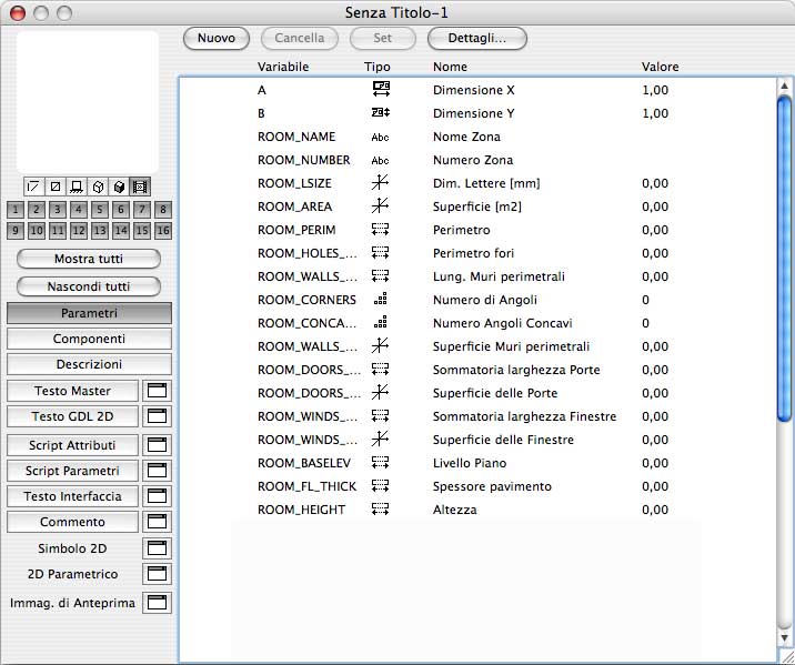 Nella pare inferiore della finestra, vengono elencate tutte le variabili globali, utilizzate dal programma, che restituiscono, automaticamente, una serie di informazioni quantitative sulla zona identificata in pianta. Queste variabili non sono editabili, potremo utilizzarle per ricavarne delle informazioni ma non potremo modificarle. Nella parte sinistra si trova il nome identificativo della variabile, seguito dal tipo (numero intero, numero reale, angolo, ecc), dal nome descrittivo ed, infine, da un valore di default che viene utilizzato per la visualizzazione in anteprima del simbolo nei vari dialoghi, quando, non essendo collegato a nessuna zona in pianta, il programma restituisce i valori di default inseriti dall'operatore per rappresentare il simbolo parametrico nel dialogo. Vediamo ad una ad una le variabili suddette: