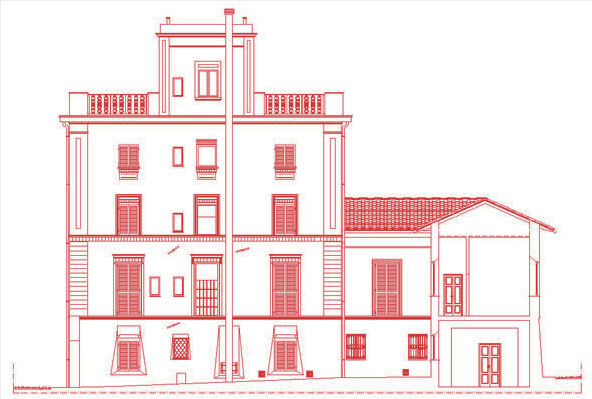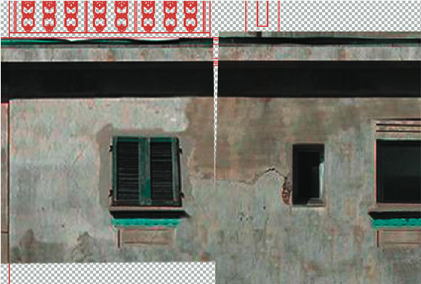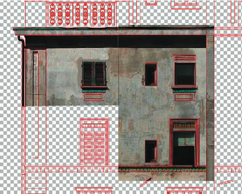 Alla base di tutto c'è, come sempre, il rilievo. E' infatti importante rilevare la posizione esatta delle finestre (e quanti più dettagli sia possibile) in modo da avere dei riferimenti su cui appoggiare le foto da raddrizzare. Una volta disegnato il prospetto a linee 2D con ArchiCAD occorre selezionarle tutte e colorarle, per facilitarne la visualizzazione in Photoshop, di rosso.