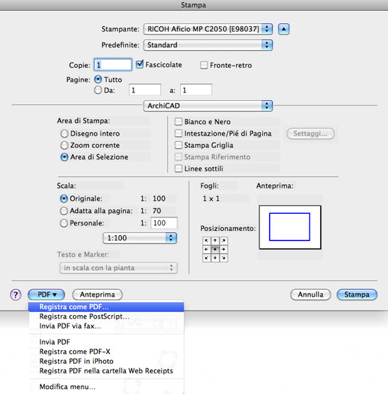 Purtroppo ArchiCAD non ha più come formato di esportazione l'EPS, ma niente paura, c'è il formato PDF ! Salviamo quindi il file di ArchiCAD in formato PDF. Questo procedimento è possibile sia attraverso l'uso del Navigatore (pubblicazione) che attraverso il comando Stampa. Di seguito la schermata di registrazione del documento PDF tramite il comando Stampa di ArchiCAD.
