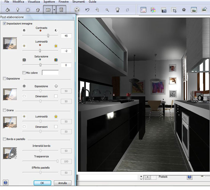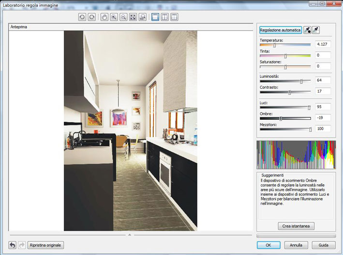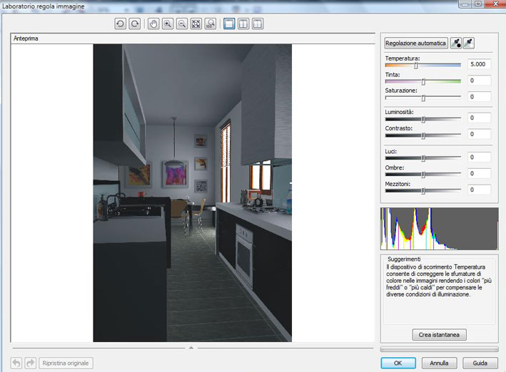 Eseguito il render apriamo l’immagine con il nostro programma Corel Photopaint, andiamo sul menù a tendina “REGOLA” e clicchiamo su “LABORATORIO REGOLA IMMAGINE”; si aprirà un’altra finestra come da immagine seguente:
