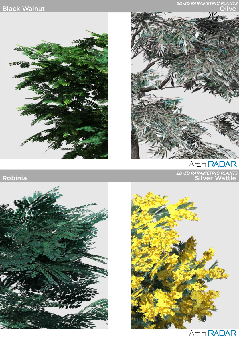 18 Modelli 3D di piante diverse, compatibili con ArchiCAD 16 o superiore e ottimizzate per CineRender.