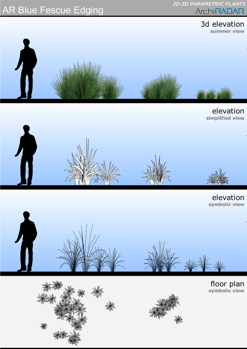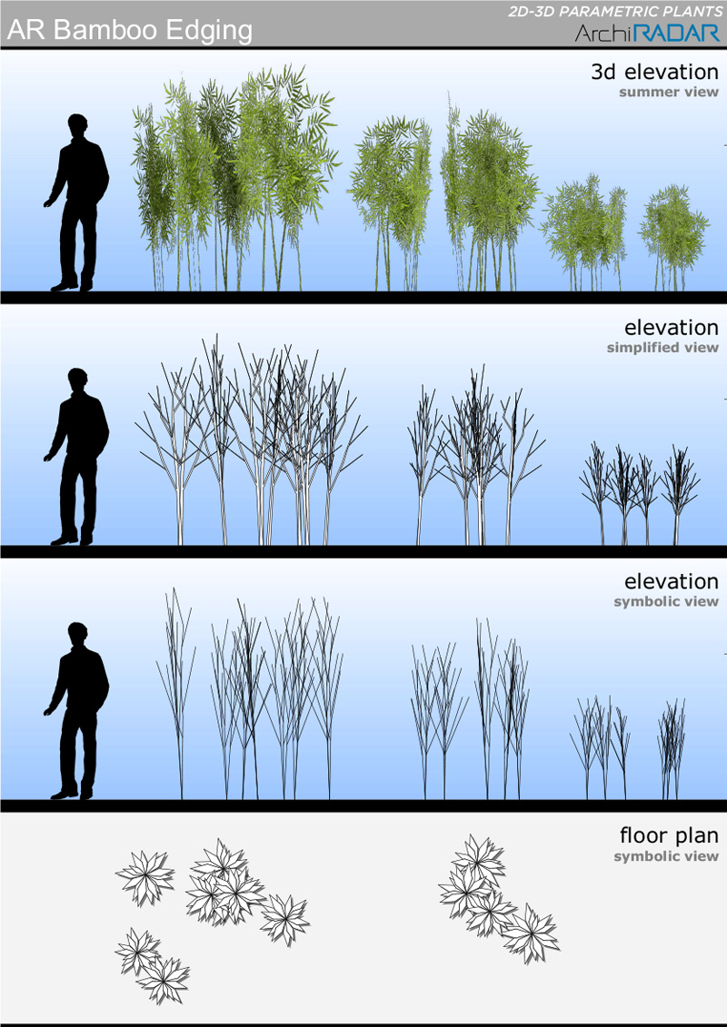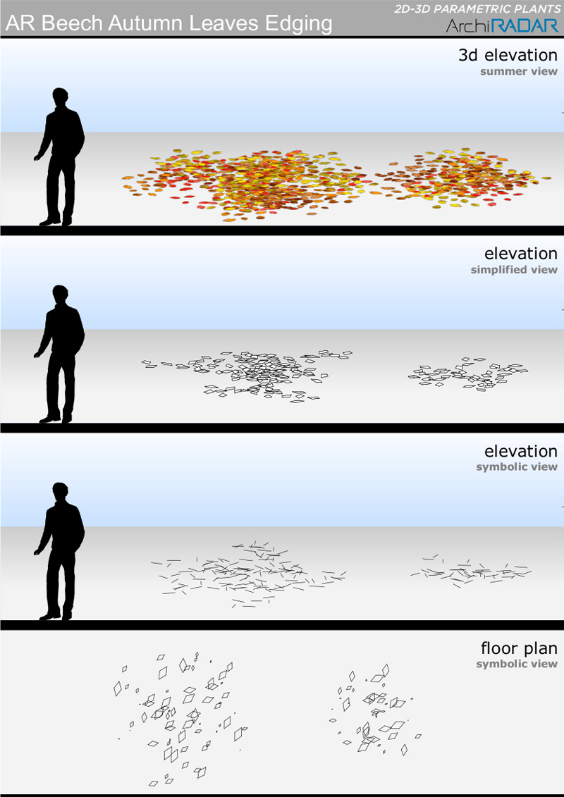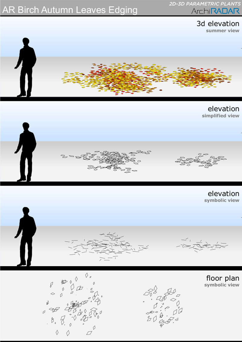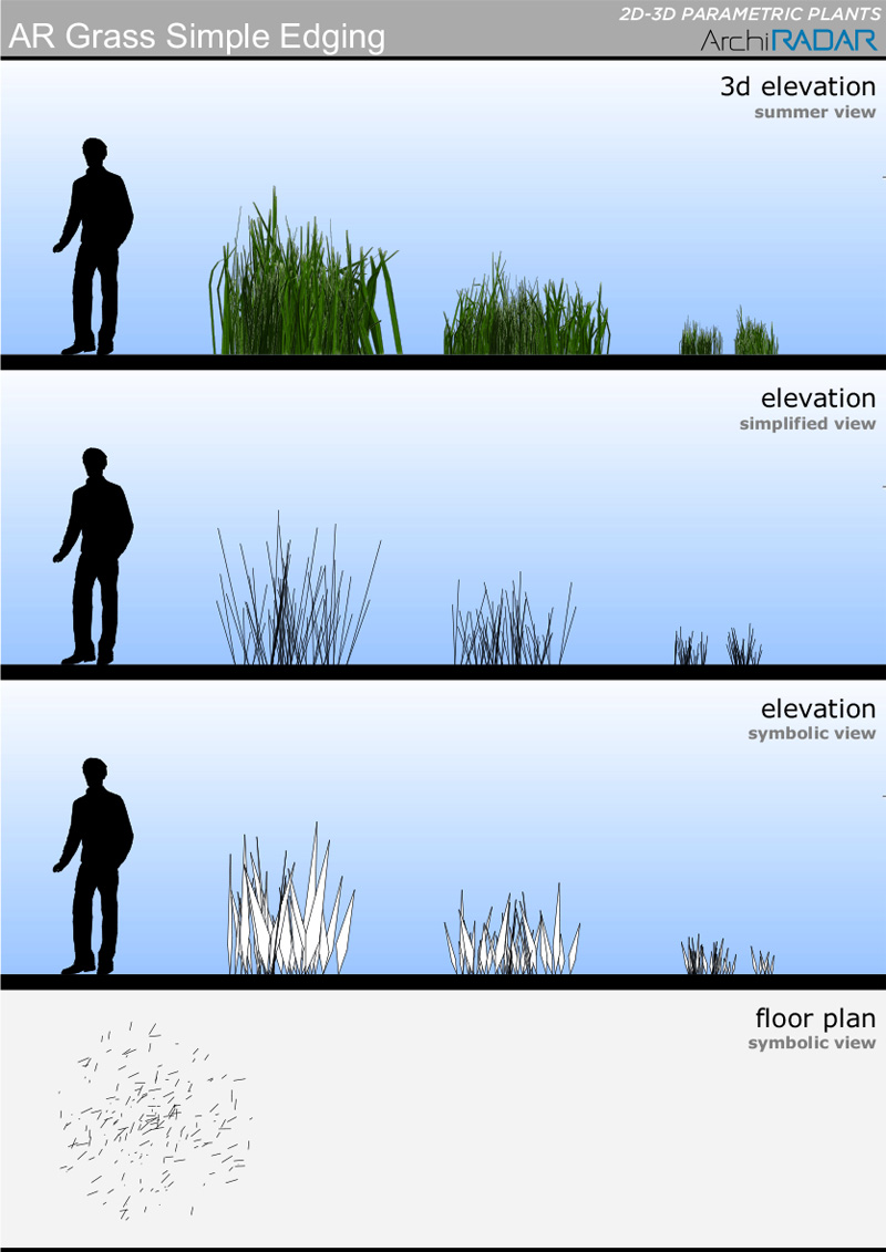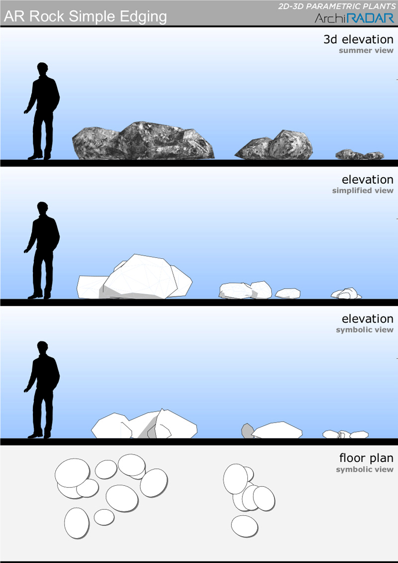 Gli oggetti sono realizzati con un basso numero di poligoni, hanno un fattore di crescita reale in base alla dimensione e inoltre hanno una corrispondente vista simbolica semplificata in prospetto e sezione.