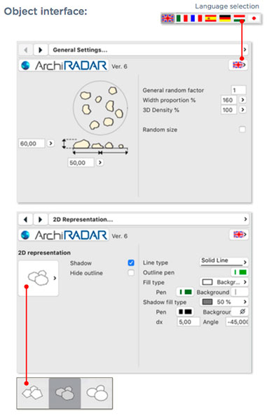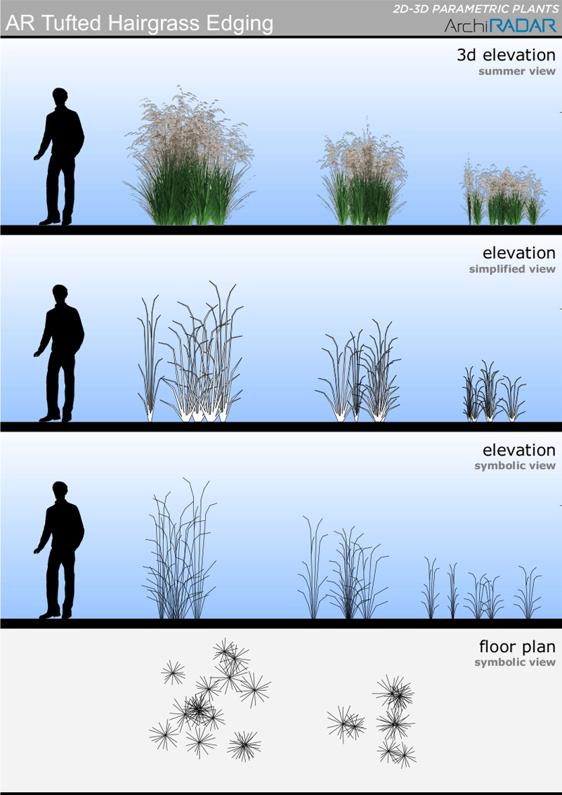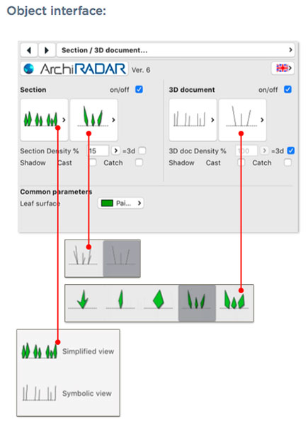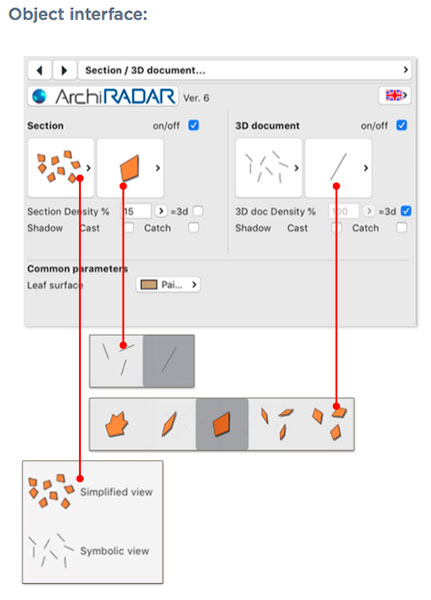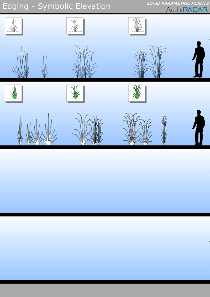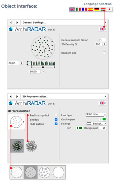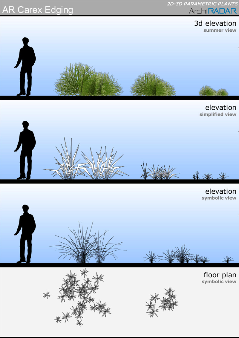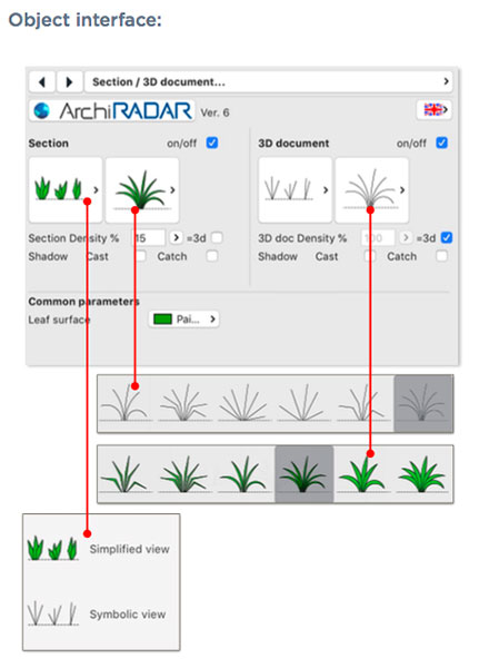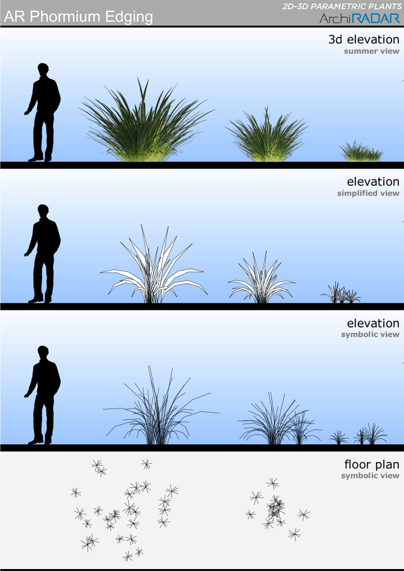 Gli oggetti sono realizzati con un basso numero di poligoni, hanno un fattore di crescita reale in base alla dimensione e inoltre hanno una corrispondente vista simbolica semplificata in prospetto e sezione.