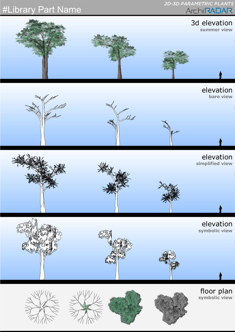 Opzioni disponibili all'interno degli oggetti:- Fattore di crescita reale- Vista simbolica in prospetto e sezione- Simbolo 2D con ombre- Simbolo 2D realistico- Livelli di dettaglio 3D- Opzione vento nei filmati- Stagioni (non per i sempreverdi)